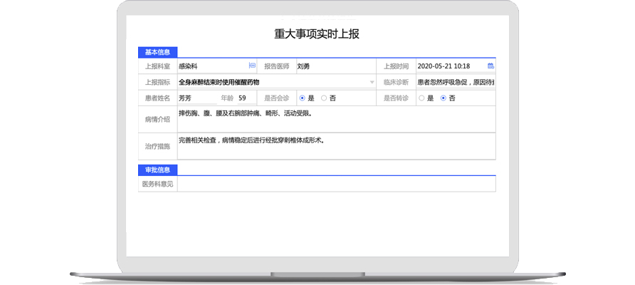 有助于您的醫(yī)務(wù)人員對疑難危重病人、醫(yī)療糾紛等重大事項(xiàng)及時(shí)上報(bào)處理,報(bào)告內(nèi)容準(zhǔn)確、規(guī)范,方便管理部門智能高效審批,有效降低醫(yī)院醫(yī)療風(fēng)險(xiǎn)。