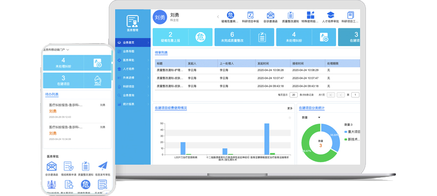 您可以查看包括項(xiàng)目經(jīng)費(fèi)使用、人才培養(yǎng)、外來進(jìn)修考勤、質(zhì)量整改、醫(yī)療糾紛處理等數(shù)據(jù),在專屬業(yè)務(wù)門戶中按權(quán)限圖形化展示,方便醫(yī)務(wù)管理相關(guān)領(lǐng)導(dǎo)對醫(yī)務(wù)工作開展情況一目了然。