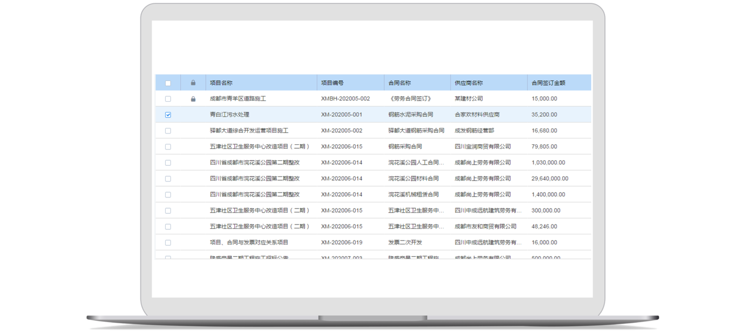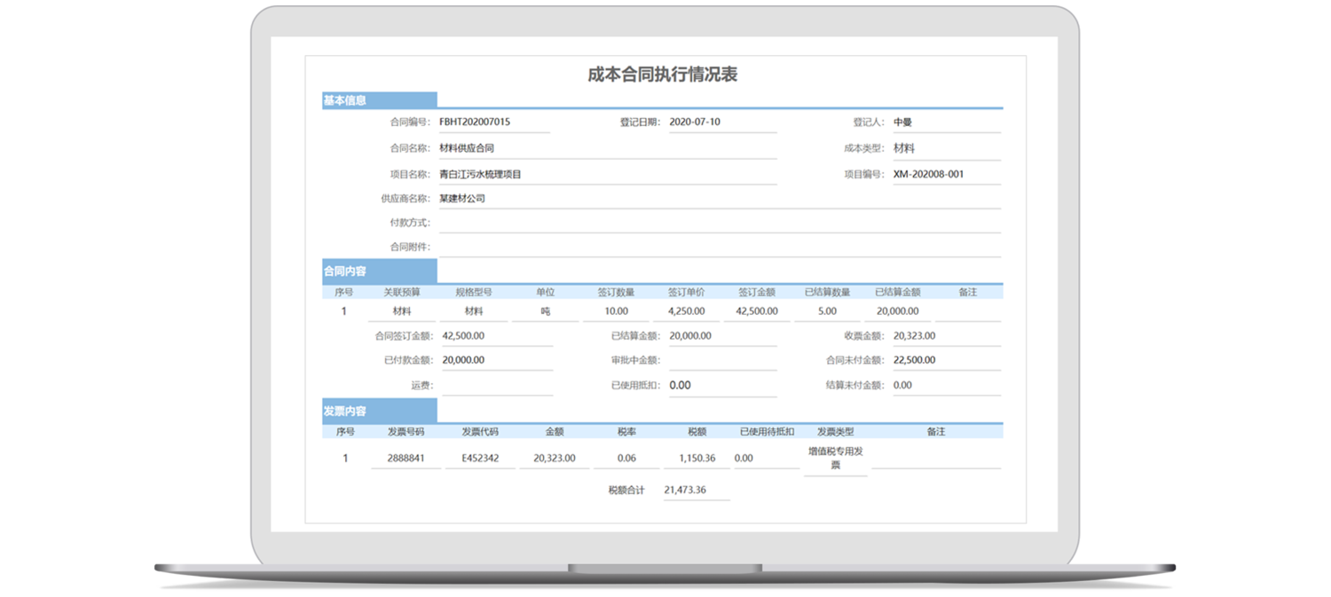 成本合同檔案信息全覆蓋,合同履約執行過程清晰明了;合同履約過程中產生的各項履約數據自動匯總到各合同檔案中,履約數據包含合同簽訂情況、結算金額、收票金額、付款金額、正在付款審批中金額、未付金額,以及合同的收票明細,管理者可隨時查看各合同的履約情況。在合同付款審批過程中也可直接調用查看這些數據,避免了無依據盲目付款的情況。