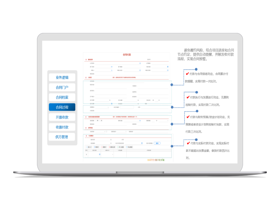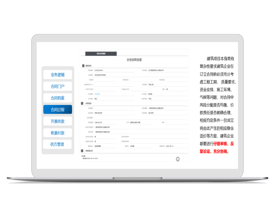 由洽談、草擬、簽訂、生效,直至合同失效為止。不僅要重視簽訂前的管理,更要重視簽訂后的管理。合同與項目、分包分供方、材料、勞務等信息緊密相連,建立基于合同的主數據平臺,靈活調用。