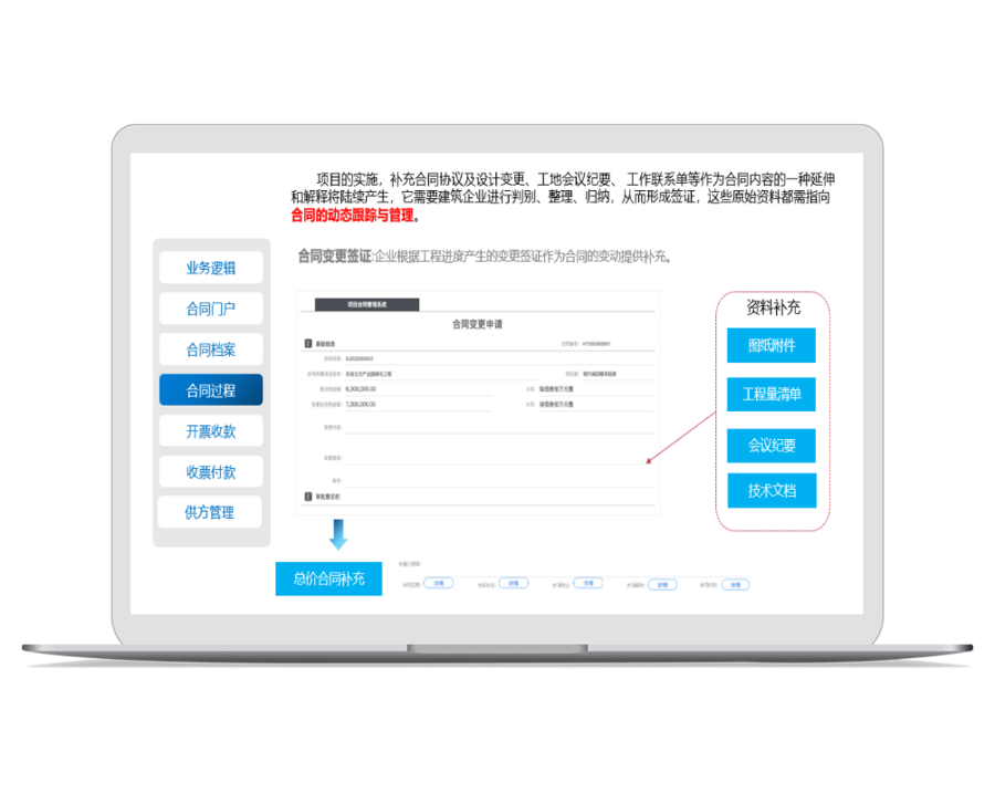 將合同變更規范化、程序化,做到實時有據可循。工程量清單、圖紙附件、會議紀要、技術文檔、總價合同補充等內容皆可進行詳細填寫。