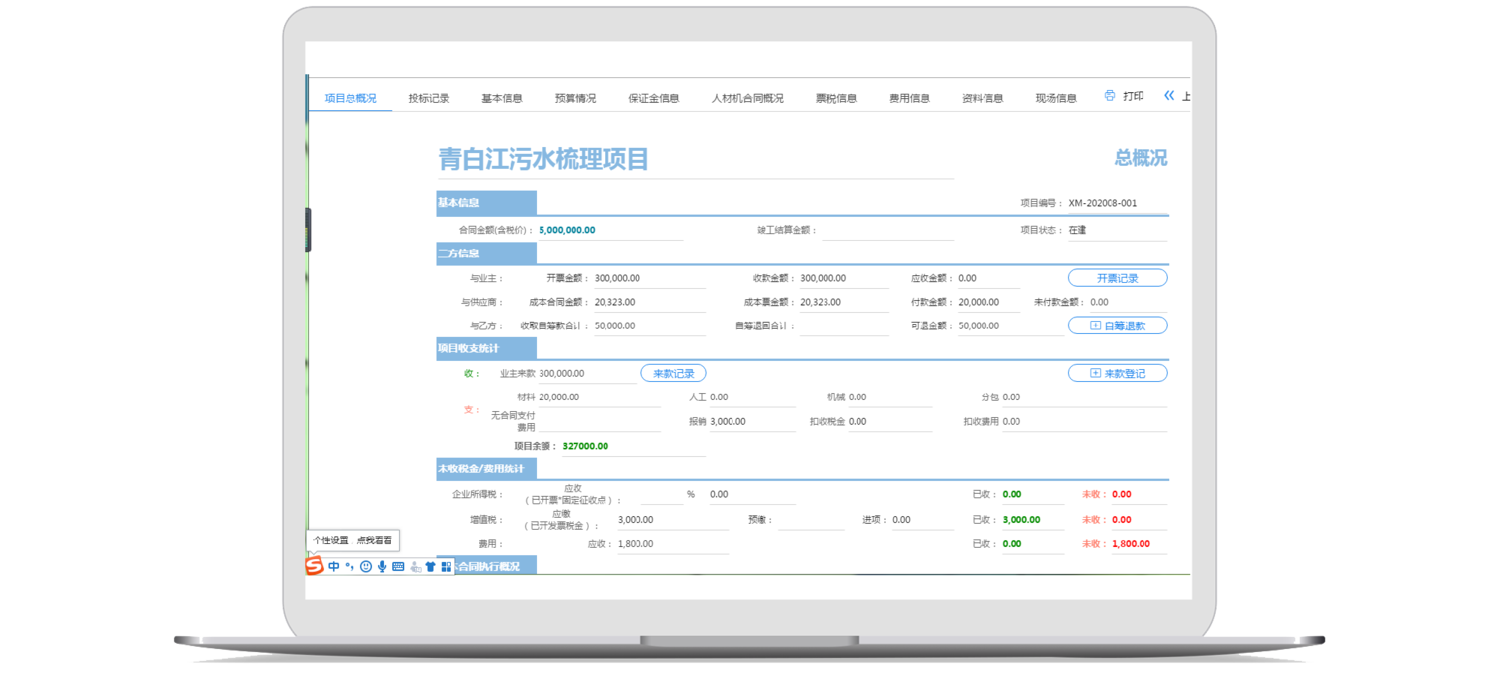 包含項目基礎數據,保證金數據、成本合同數據、收支數據、票稅數據、費用數據、現場信息、資料信息,集中歸于一個平臺上,利于項目數據的查看分析。