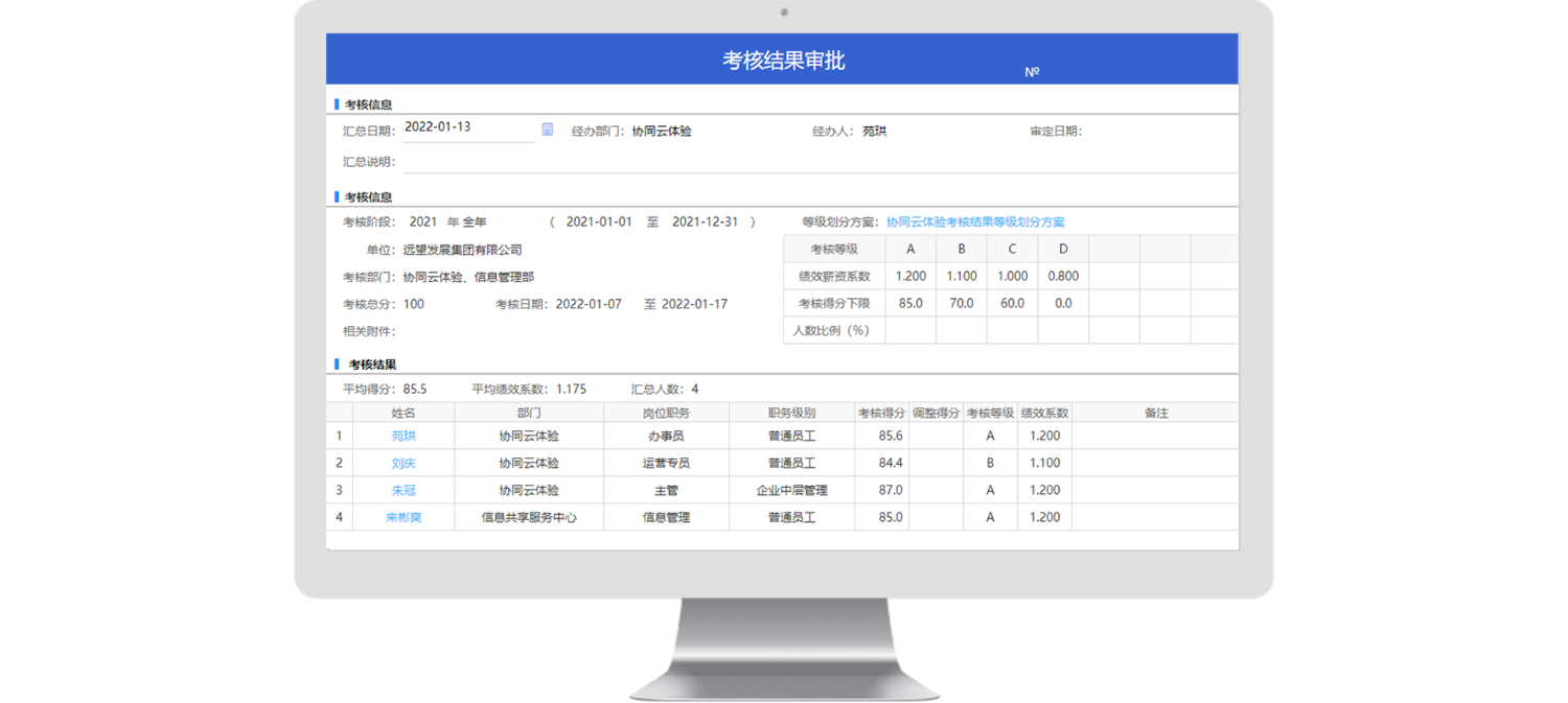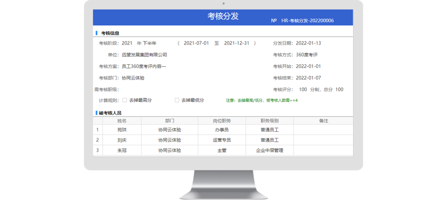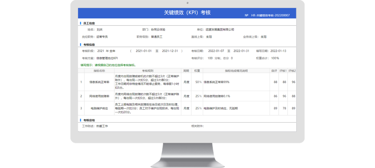 從考核等級(jí)定義、考核方案設(shè)置、考核分發(fā)到員工考核,再到考核結(jié)果匯總并審批,對績效考核全過程進(jìn)行閉環(huán)管理,數(shù)據(jù)讀取便捷,流程處處留痕,降低人工出錯(cuò)成本。
