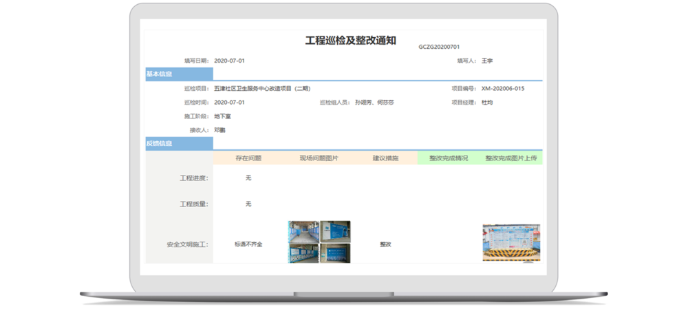 項目巡檢結果以文字描述加圖片的方式記錄提交,相關負責人可以直觀地看到問題所在并提出精準的整改方案。整改后將整改好的部位重新拍張上傳,與整改前的圖片一一對比就能清楚的判定整改的效果。且巡檢整改記錄自動存檔,方便之后隨時查看。