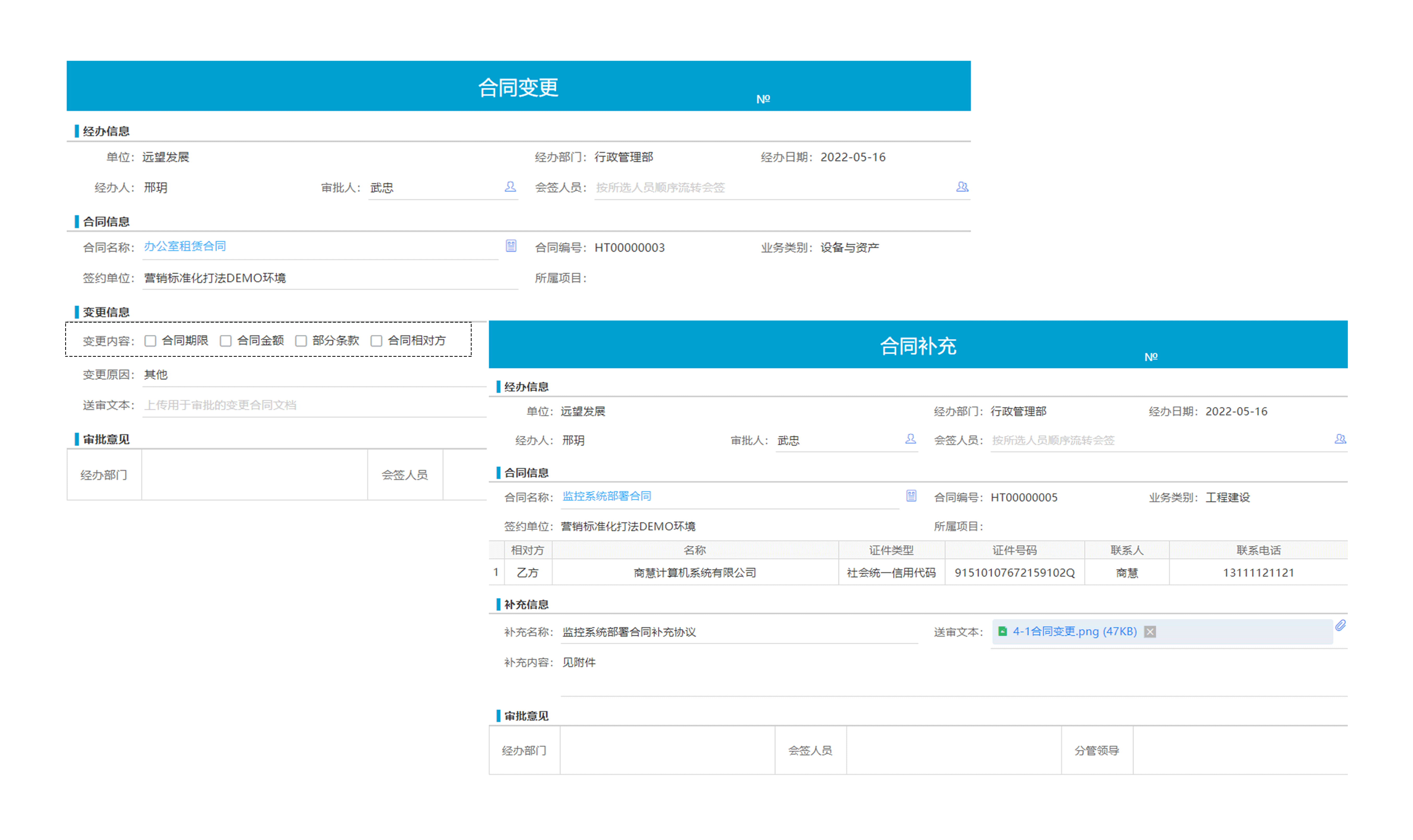 合同變更及補(bǔ)充:支持對(duì)執(zhí)行中的合同進(jìn)行信息變更或增加補(bǔ)充合同,變更申請(qǐng)與合同信息關(guān)聯(lián),審批通過(guò)后系統(tǒng)自動(dòng)更新合同檔案、存儲(chǔ)變更后的合同文本、記錄每次合同變更補(bǔ)充原因、時(shí)間、經(jīng)辦人等,信息同步、便于追溯。
