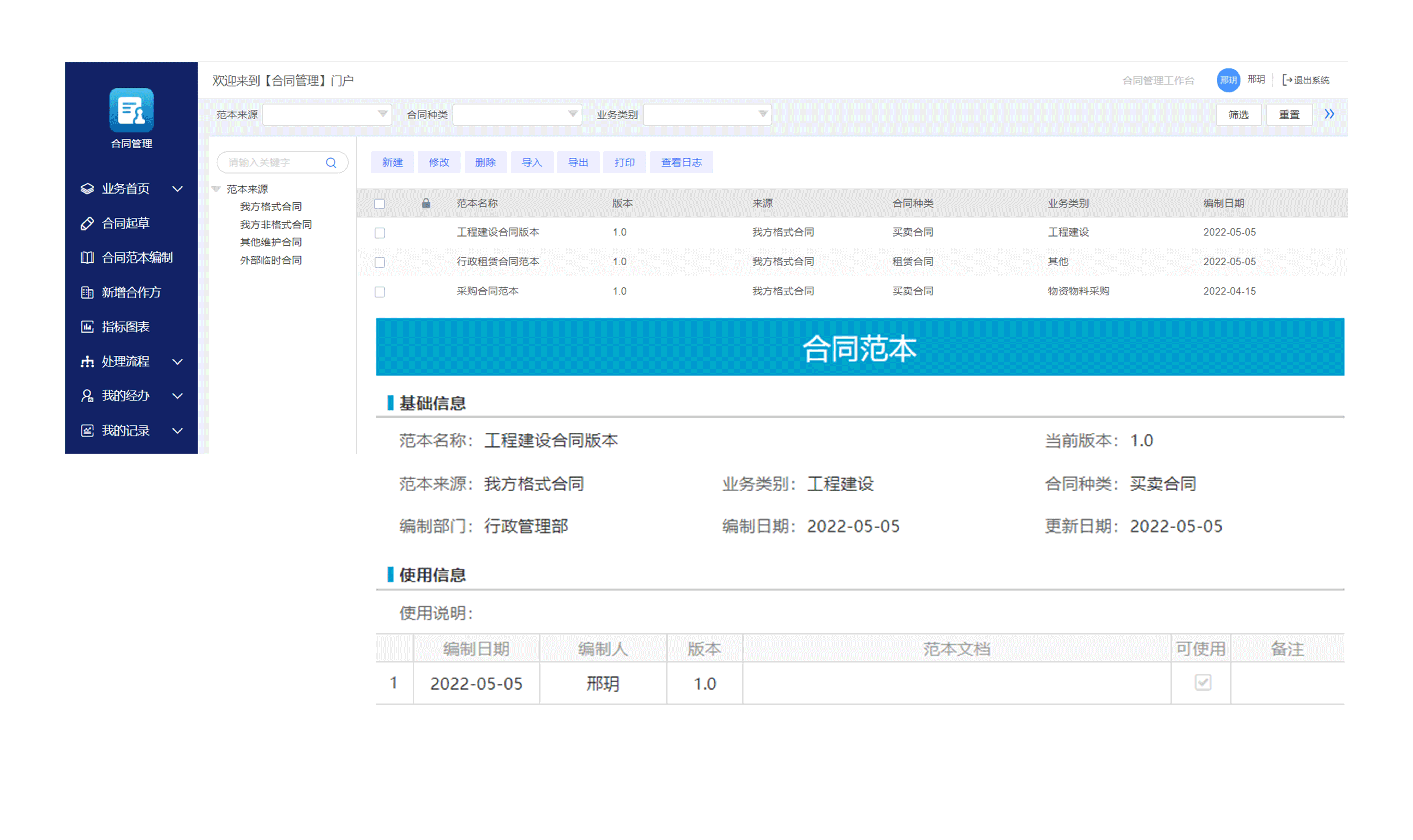 合同范本管理:支持根據(jù)單位需要進(jìn)行合同范本編制,明確使用范圍及維護(hù)人員,實(shí)現(xiàn)相關(guān)合同文本和版本的統(tǒng)一管理和規(guī)范使用,提升合同質(zhì)量和起草效率,減輕業(yè)務(wù)及管理部門審核工作量。