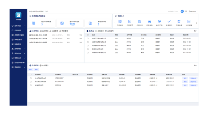依據(jù)合同管理需求,設(shè)置專業(yè)的合同管理門戶,個(gè)性化呈現(xiàn)個(gè)人經(jīng)辦的合同數(shù)量、履約金額等相關(guān)指標(biāo),以及各類待辦事務(wù)、流程發(fā)起及業(yè)務(wù)數(shù)據(jù)錄入快捷入口等,界面簡(jiǎn)明、信息聚焦、操作方便。