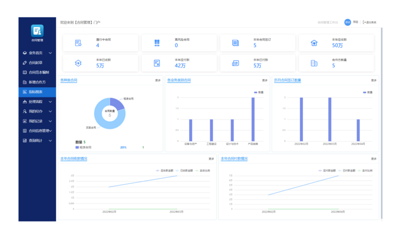 系統(tǒng)自動(dòng)匯總企業(yè)合同簽訂情況、履行狀態(tài)、合同類型、收付款情況、合作方等,形成視圖化的指標(biāo)圖表,管理層關(guān)注的實(shí)際收付款情況、應(yīng)收應(yīng)付款金額、指標(biāo)完成情況一屏展現(xiàn),企業(yè)合同狀況實(shí)時(shí)掌握。