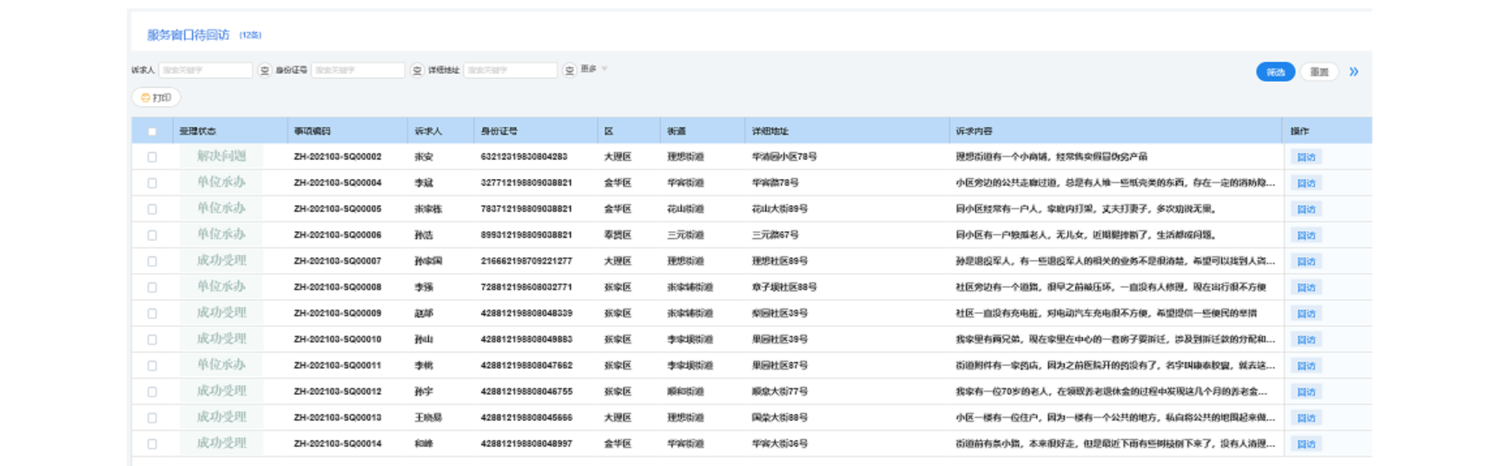受理窗口作為面對民眾的優先入口,所有辦理情況和結果都將及時反饋至受理窗口中,受理窗口工作人員可以快速知曉需要回訪的事項,做到“事無巨細,件件回訪”。